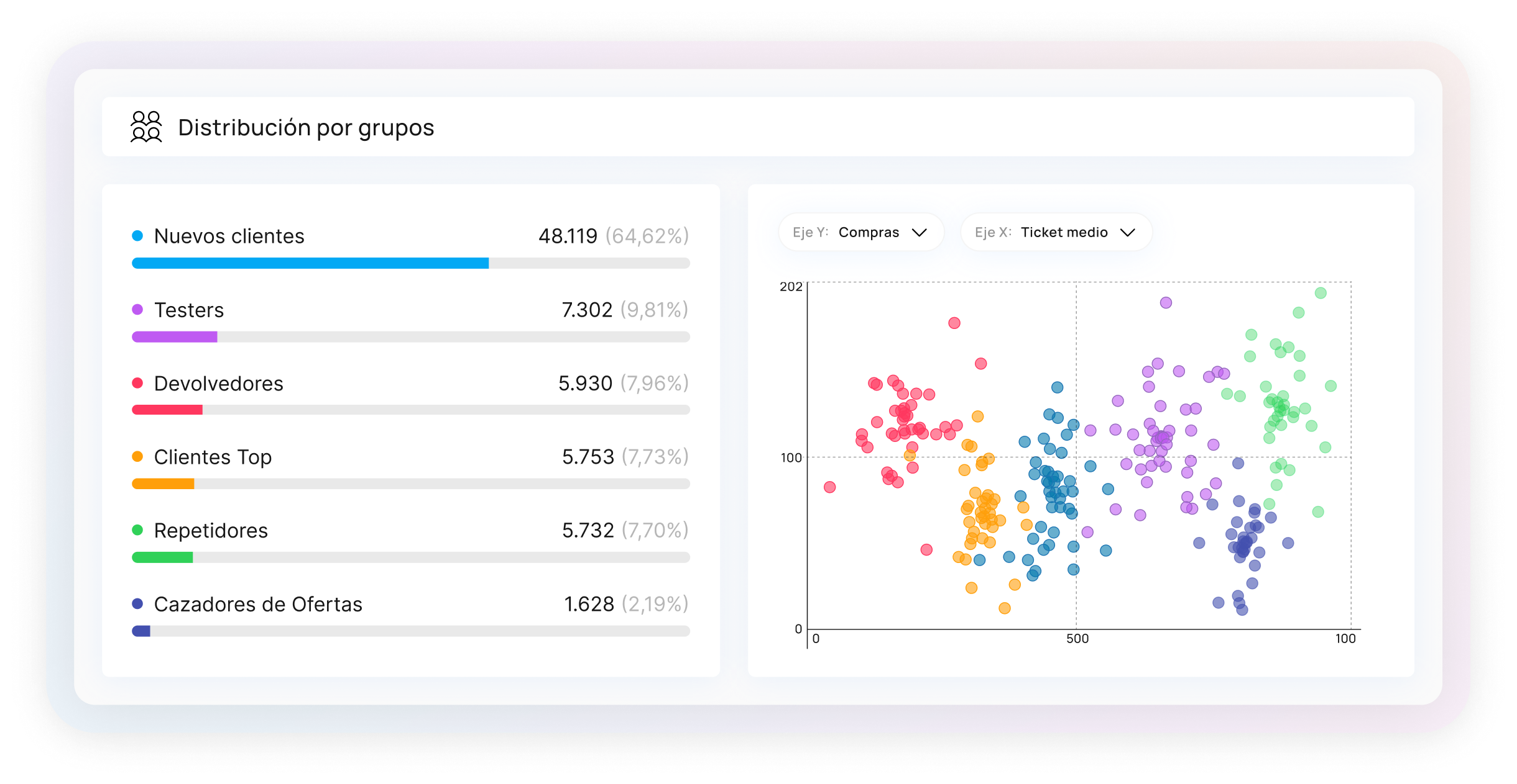 Waibo construye segmentos inteligentes de clientes a partir de la comprensión de tu negocio y el análisis del comportamiento de compra, navegación o indicadores socioeconómicos. Analiza la evolución de los grupos a lo largo del tiempo y disfruta de insights directamente accionables, conectados de forma bidireccional con tus canales de marketing.