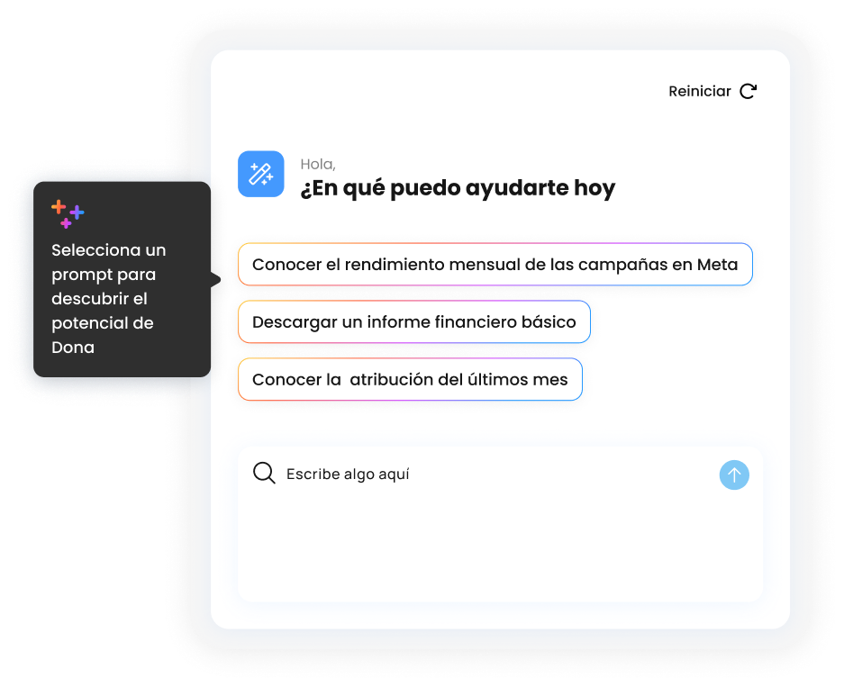 ¿Cuál está siendo la campaña de anuncios más rentable?, ¿cómo ha evolucionado la recurrencia de compra en el último año?, ¿y el CLV medio de tus clientes? Dona responde en segundos a las preguntas más complejas sobre tu negocio. Aprovecha toda la potencia de GPT de manera segura, privada, sin filtración de datos.