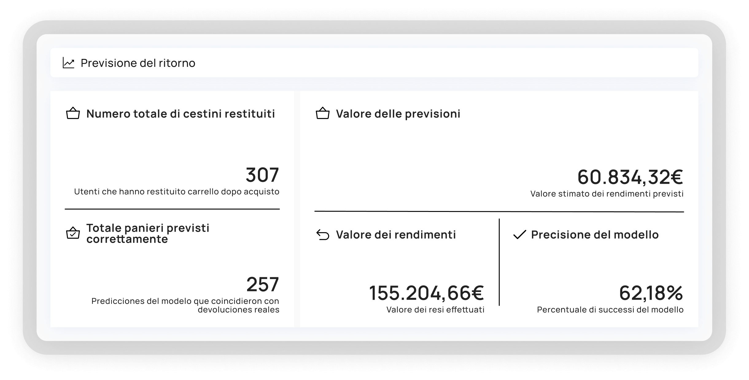 Waibo vi aiuta a iniziare a guardare in modo diverso il churn o i ritorni, i due principali nemici di ogni business digitale. Lavoriamo con l’AI predittiva e i dati contestuali per anticipare, identificando gli ordini con un’alta propensione al reso o agendo sui clienti alla fine del loro ciclo di vita prima che vi abbandonino.
