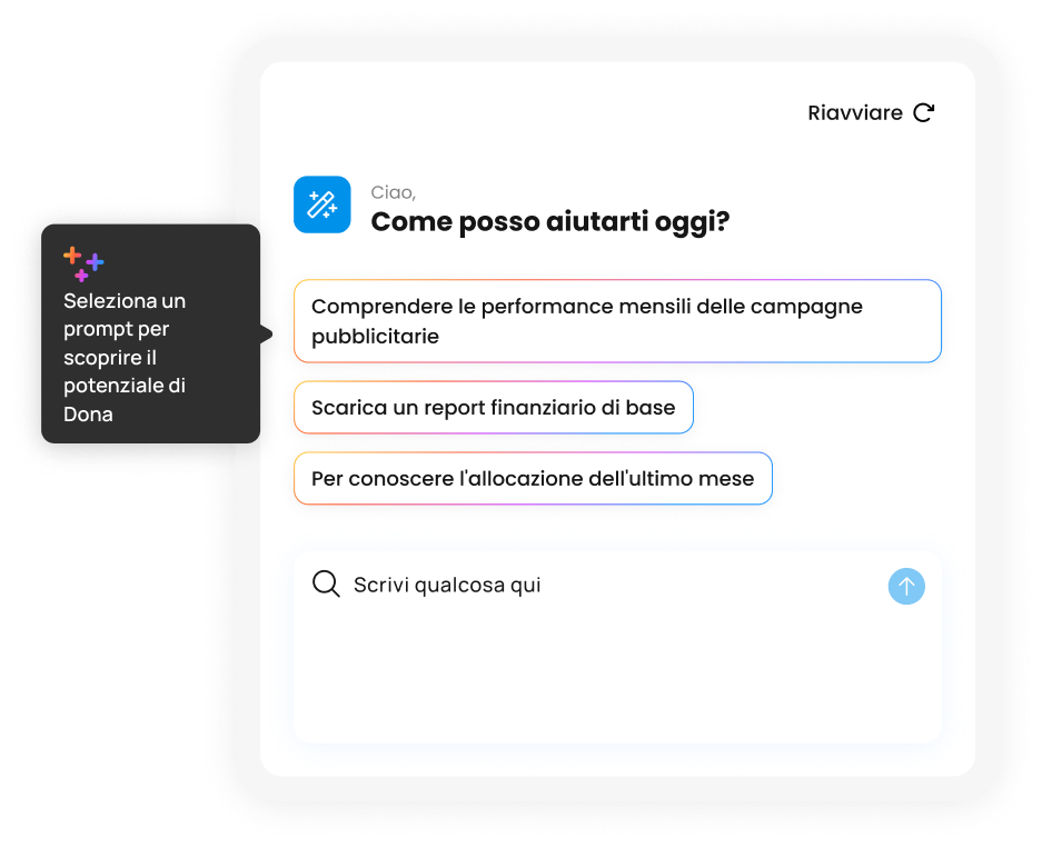 Qual è la campagna pubblicitaria più redditizia, come si è evoluta la ricorrenza degli acquisti nell’ultimo anno e qual è il CLV medio dei vostri clienti? Dona risponde alle domande più complesse sulla vostra attività in pochi secondi. Sfruttate tutta la potenza del GPT in modo sicuro e privato, senza perdita di dati.