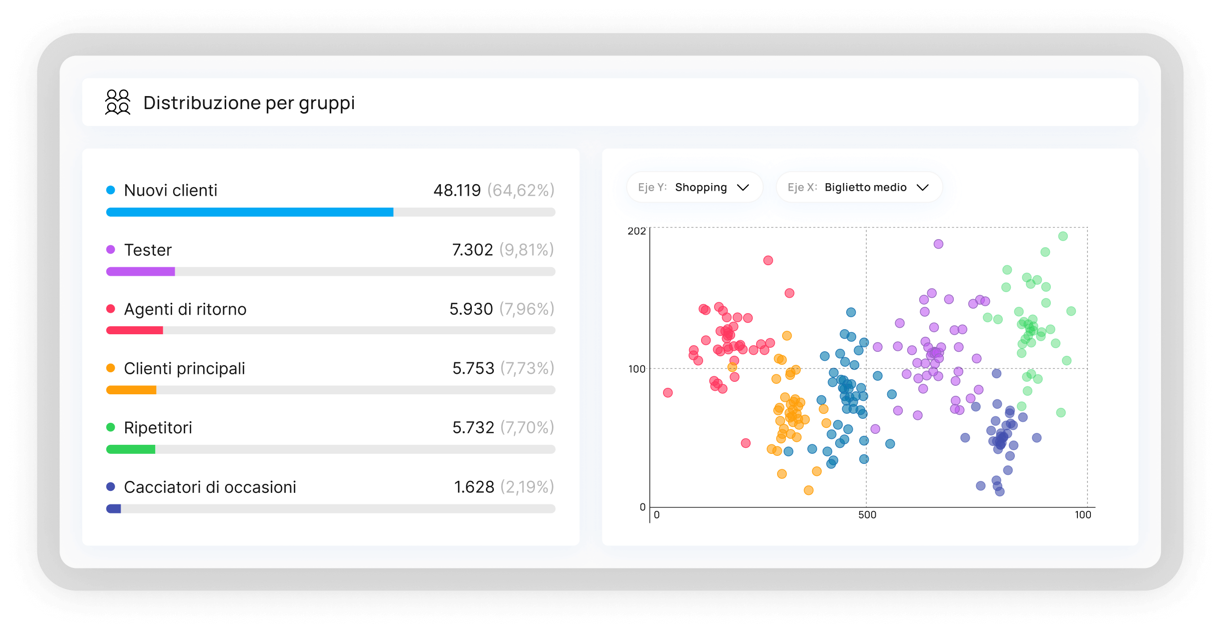 Wibo costruisce segmenti di clienti intelligenti a partire dalla comprensione della vostra attività e dall’analisi del comportamento d’acquisto, della navigazione o degli indicatori socio-economici. Analizzate l’evoluzione dei gruppi nel tempo e godetevi gli insight direttamente utilizzabili, collegati bidirezionalmente con i vostri canali di marketing.